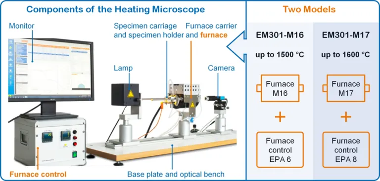 In the EM301 heating microscope, test pieces are analysed optically using a non-contact technique at temperatures of up to max. 1600°C. The EMI III software automatically analyses silhouettes of the test piece and determines geometric parameters and characteristic temperatures. The design of the measuring cell allows materials to be heated to temperatures above their melting point. The EM301 is therefore suitable for determining:
