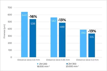 Максимальная скорость классических ультрацентробежных мельниц, таких как широко используемая ZM 200, обычно ограничена 18000 об/мин (периферийная скорость ротора 98 м/с). Мельница ZM 300 достигает максимальной скорости в 23000 об/мин (периферийная скорость ротора 118 м/с), что даёт тонкость измельчения на 15 - 20% лучше, в зависимости от конкретного материала.